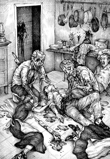 I charge across the room, and give the first of the undead a solid high kick to the head. He must have been undead for a while, because his head spins off with the single blow and lands in Miss Bingley’s lap. Ha ha, she was just coming to.